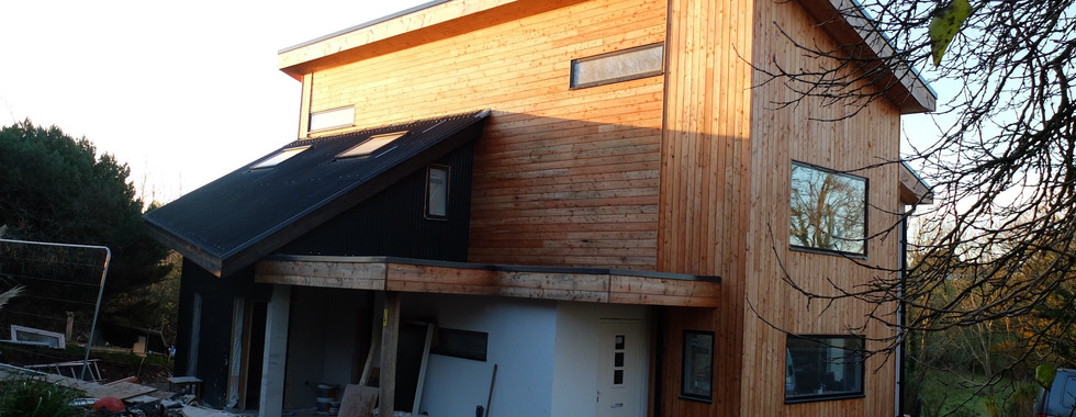 The clients brief was to design a cost effective sustainable building that could house the family of 4 with minimum running costs an abundance of natural light, and feel like a home. This building is constructed using a 235mm full filled structure with a multi-foil layer internal to provide exemplar air tightness. The roof contains a full fill insulation with a further rockslab mineral wool insulation over. The multi-foil internal airtightness insulation layer includes a battened services zone to prevent penetrations into the airtight layer and provide a void space for services. Externally the walls are sheathed with a breathable board with ventilated cavity and render board with silicone render finish, fibre cement sheeting or timber cladding. The floor has a ground bearing insulation with steel reinforced slab over creating a cold bridge free insulated slab. The intention of the design was to provide a replacement dwelling with improved living conditions and reduced carbon footprint. High levels of insulation and the reuse of the biomass wood burner combine to create a very sustainable dwelling. The Architectural style has been curated around the need to maintain a rustic aesthetic whilst ensuring that the design has continuity. A choice pallet of materials to the external finishes have been selected to maintain a modest dwelling in the countryside.